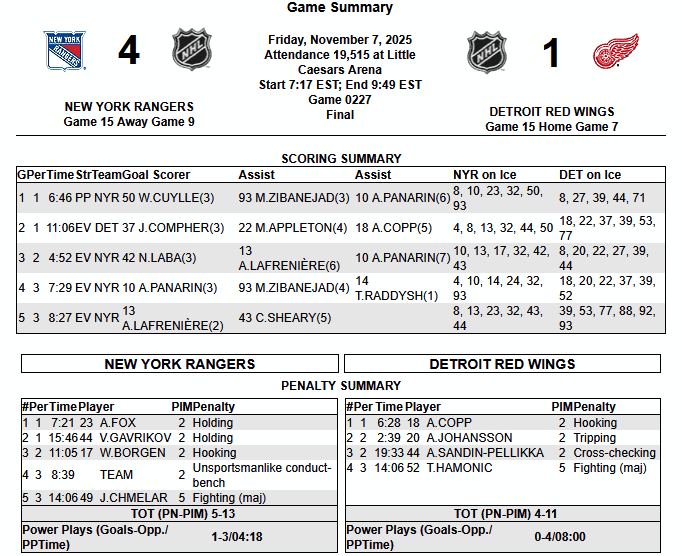 Rangers went on a quick trip to Detroit and, as expected, won the game 4-1. Why? Because it was on the road 😉 A great night for Laba, a Michigan native who had about a quarter of the arena filled with his friends and family, at least it was a very large number. Panarin and Lafreniere finally got on the score sheet after long droughts as well. Cuylle got an early goal on the PP as well as a nasty bruise from blocking a shot with his leg. It was a good overall effort, not much slacking off in this one. One thing of interest was a later game change in defensive pairings to put Schneider on the right of Soucy and Robertson back with Borgen. Might see that again tonight based on Sully post game presser. Game stats: