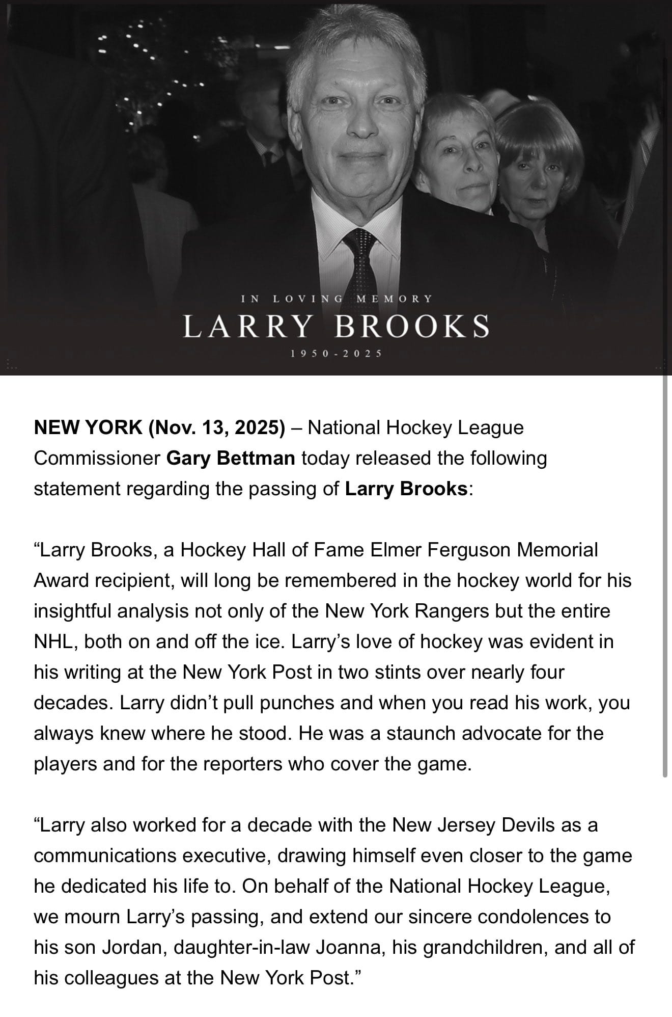 It is with a very sad heart we learn this morning of the passing of Hall of Fame hockey writer Larry Brooks at the too young age of 75. Brooks was the long time NYR beat writer and thorn in the side of many a coach and some players after spending time in the NJD organization. Though sometimes sensational (it is a business afterall), his columns were often insightful both in capturing what fans were thinking as well as suggesting ways the team could improve. Larry will be missed greatly! 😢