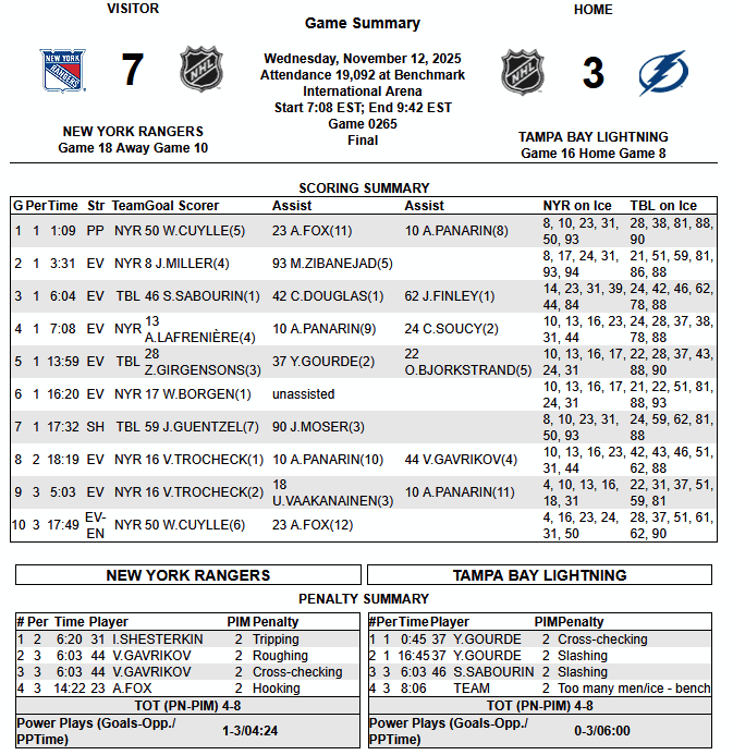 The first period was a 4-3 NYR game of pond hockey. Everytime you thought the Rangers would pull ahead, Tampa would race back and score again. The second period was the quiet period, the only goal by Trocheck (1), his first of the season after missing 16(?) games. He would get his second early in the third period at which point the Rangers had doubled up the Lightning. Being down three, the Lightning pulled their goalie very early, to no avail as Cuylle (6) would get his second of the night (earlier PPG) with an empty netter.