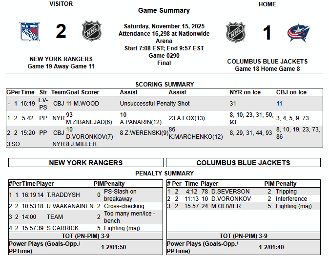 The Rangers endured a squeaker last night over the Blue Jackets, winning in OT/SO on JT Miller’s nasty snap shot. Initially, it looked like the Rangers might put up another four or more goals, they were getting that many chances while at the same time keeping CBJ in check. But it took until 05:42 of the second for the NYR to break through with a PPG goal by Zibanejad (6) putting in his own rebound from the doorstep. CBJ would return the favor 10 minutes later at 15:20 when Voronkov (7) woute tie the game at one with a PPG. And that was it for regulation scoring. Notable in the game was a fight between Carrick and Olivier just after the goal. Olivier had been taking some liberties with NYR players and Carrick stepped up to change the momentum…never mind going against one of the league tough guys. Sam I Am held his own quite well!