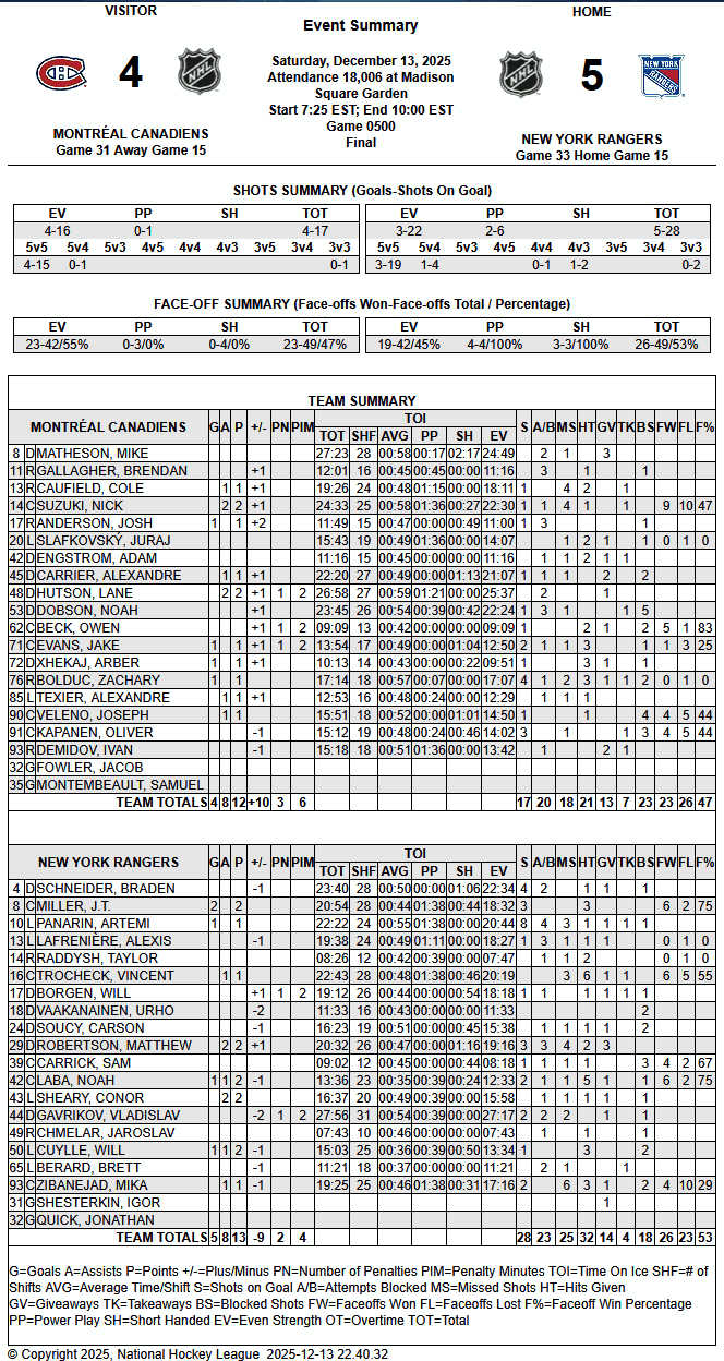 The third period saw no scoring and only five shots on goal by each team, so on to OT. The teams then traded a few misses and a few shots on goal before at 02:29 Montreal was called for a generous slashing penalty, putting the Rangers on the power play. In less than thirty seconds, JT Miller (9) would find the back of the net for his second of the night and the game winner. Zibanejad (14) and Trocheck (10) with the assists. Final score NYR 5 MTL 4.