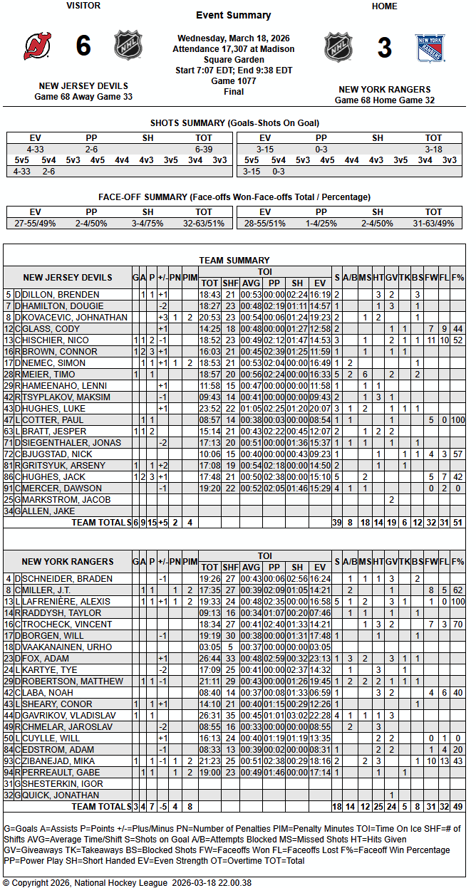 Meir (19) extended the NJD lead at 06:29 of the third but the nephew-in-law, Sheary (3), would cut it to just one goal at 09:41, assisted by Robertson (10) and Miller (25). This was Miller’s first point since 2 March and third since 28 Feb. The excitement lasted less than four minutes as TWSNBNA (18) put NJD back up by two and Bratt (16) would double the Rangers up at 16:22. Final score: NJD 6 NYR 3
