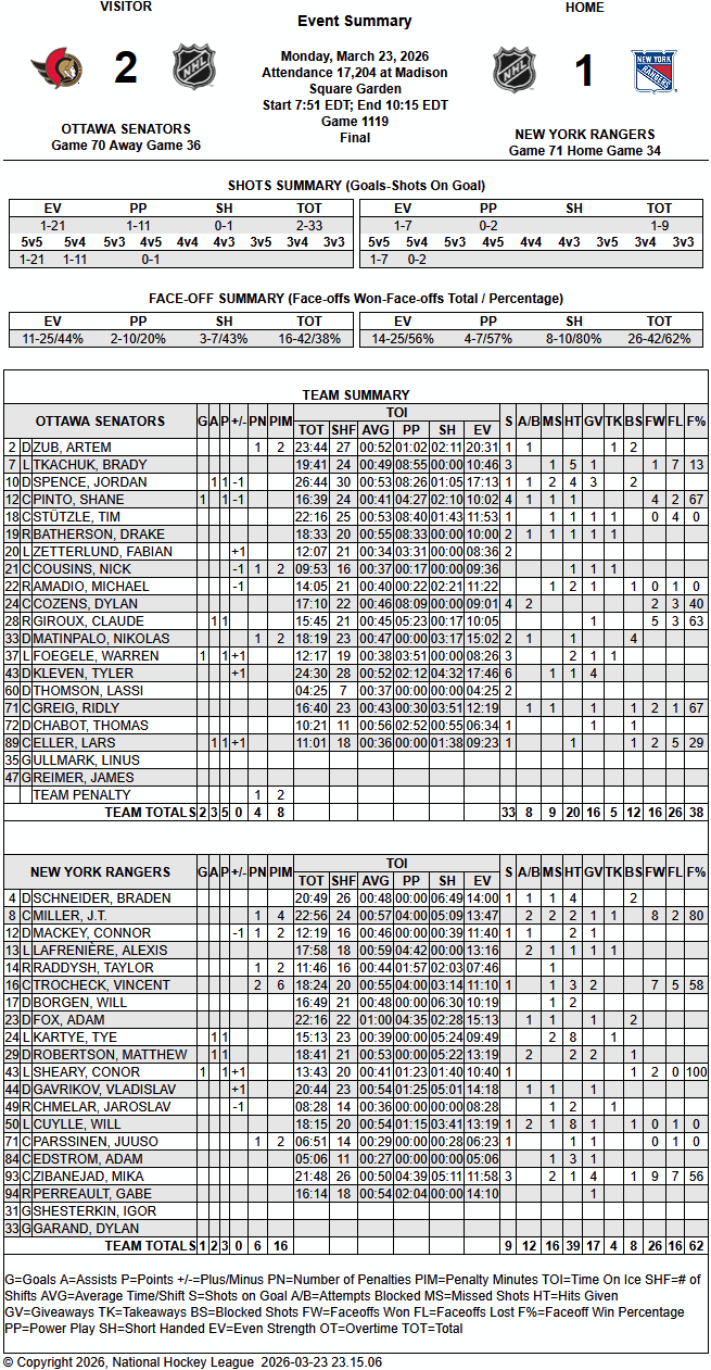 That is how many shots on goal the Rangers had last night in a losing effort against an Ottawa team striving for a playoff spot, all while in theory celebrating Zibanejad’s 1,000th NHL game. Well, they did make the record books – their effort tied the lowest total shots on goal in regulation in a regular season in their franchise history (here’s looking at you 12/11/55 2-0 loss to DET before official records were even kept).